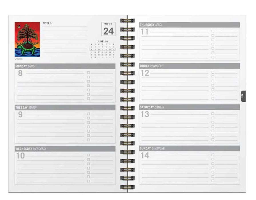 12-month 2026 weekly planner, includes 2025-2026 calendars, 128 coloured pages, 6 full page images, brass twin-wire binding, printed on high quality paper, hard front and back covers. The artists name, tribal affiliation and biography appear on the back cover.